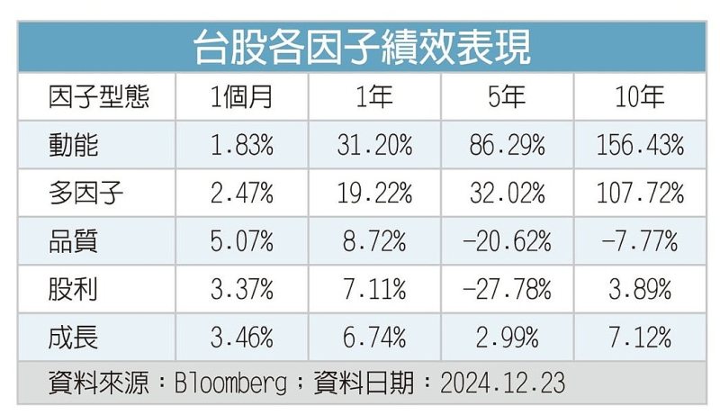 依據Bloomberg資料庫分析,將臺股區分11個不同因子,並將這些因子做歷史績效回測,可發現動能因子的表現最爲出色,不論短中長期(1年、5年、10年)的表現都是第一名,且大幅領先其他因子,代表在臺股市場中,若能有效掌握動能因子,能大幅提升投資組合的績效表現。