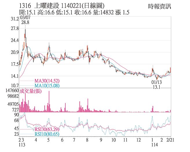 上曜(1316)因成屋建案交屋入帳,加上臺南推出「城之芯」建案預計3月開案,股價隨特定買盤進駐,21日以16.6元收漲停價,成交張數比前一交易日倍增至14,784張,外資買超1,444張,自營商加碼26張。股價突破14.2元壓力,多空量能強勢向上,KD值黃金交叉。「The King」、「梅菲爾」、「帝凡內」以及子公司長榮泰山、荷九暻等成屋建案交屋入帳,1月營收年增172%。集團在手未交屋的成屋與預售屋加總總銷473.5億元,除成屋銷售外,亦有預售屋九份子「湖映白」已近完銷,完工進度近4成,營運審慎樂觀。